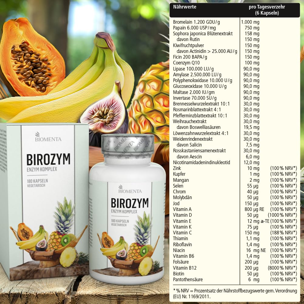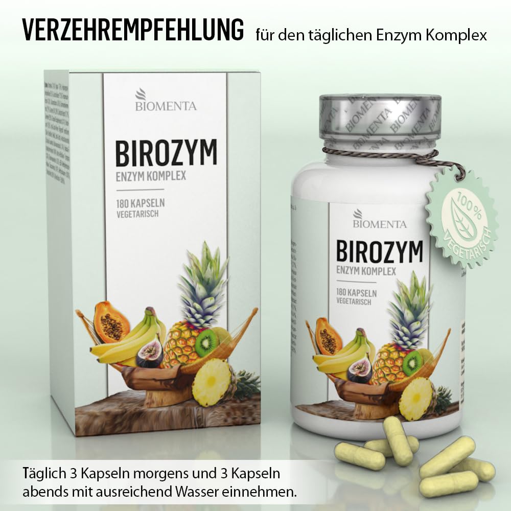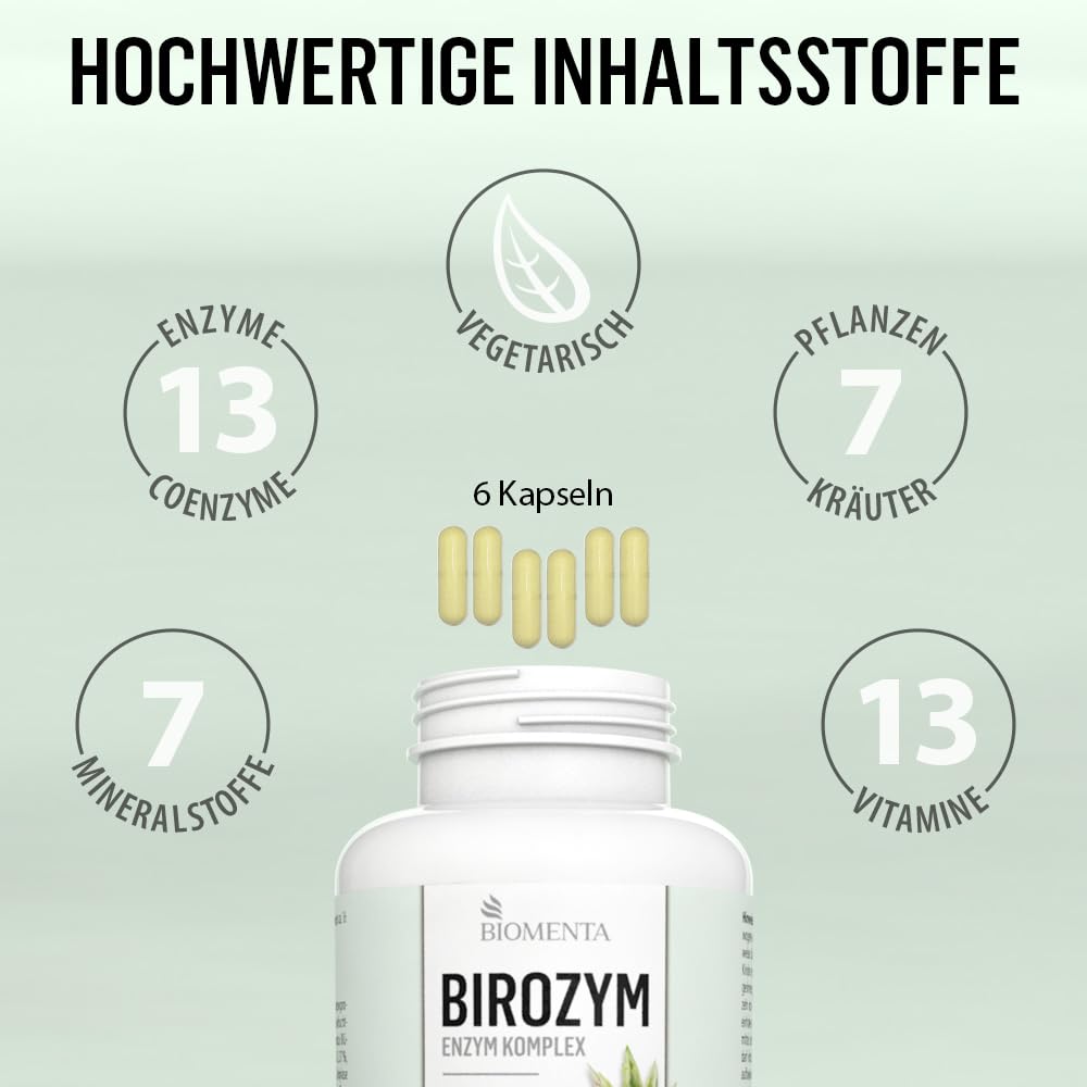 BIOMENTA - BIROZYM Enzym Komplex - 180 Multi Enzymes Kapseln hochdosiert (2,65g/Tag) -13 (Co) Enzyme + 7 Kräuter & Pflanzen + Mineralstoffe + Vitamine - vegetarisch - magensaftresistente Capsules