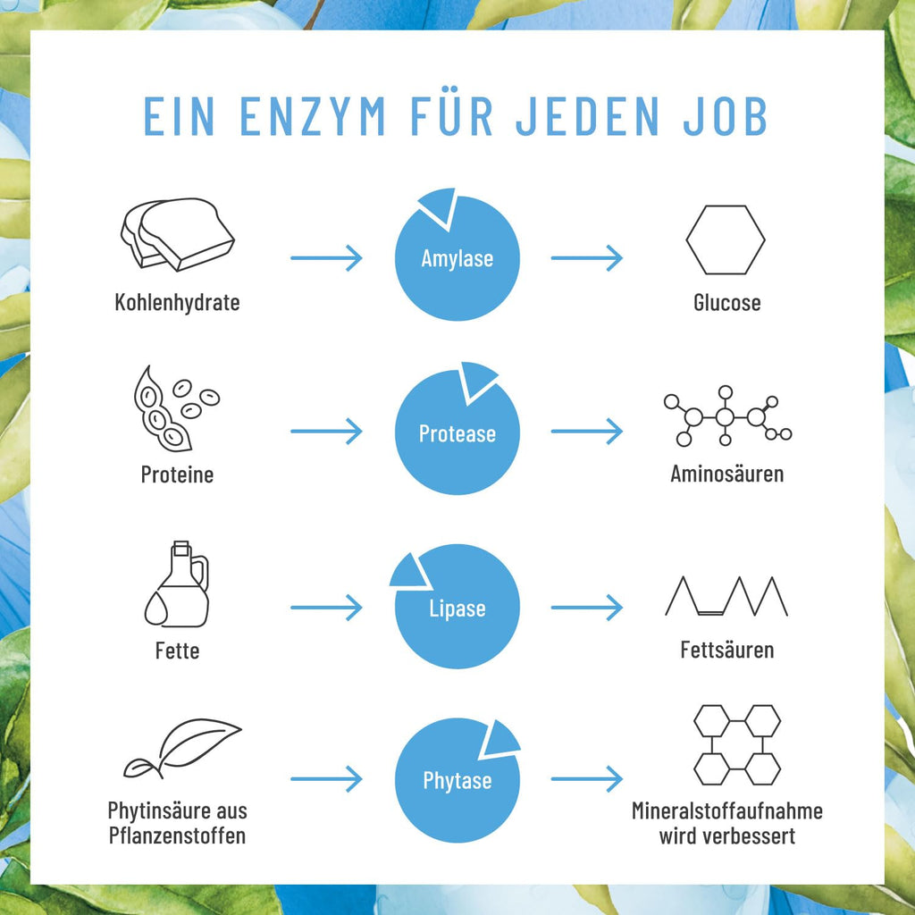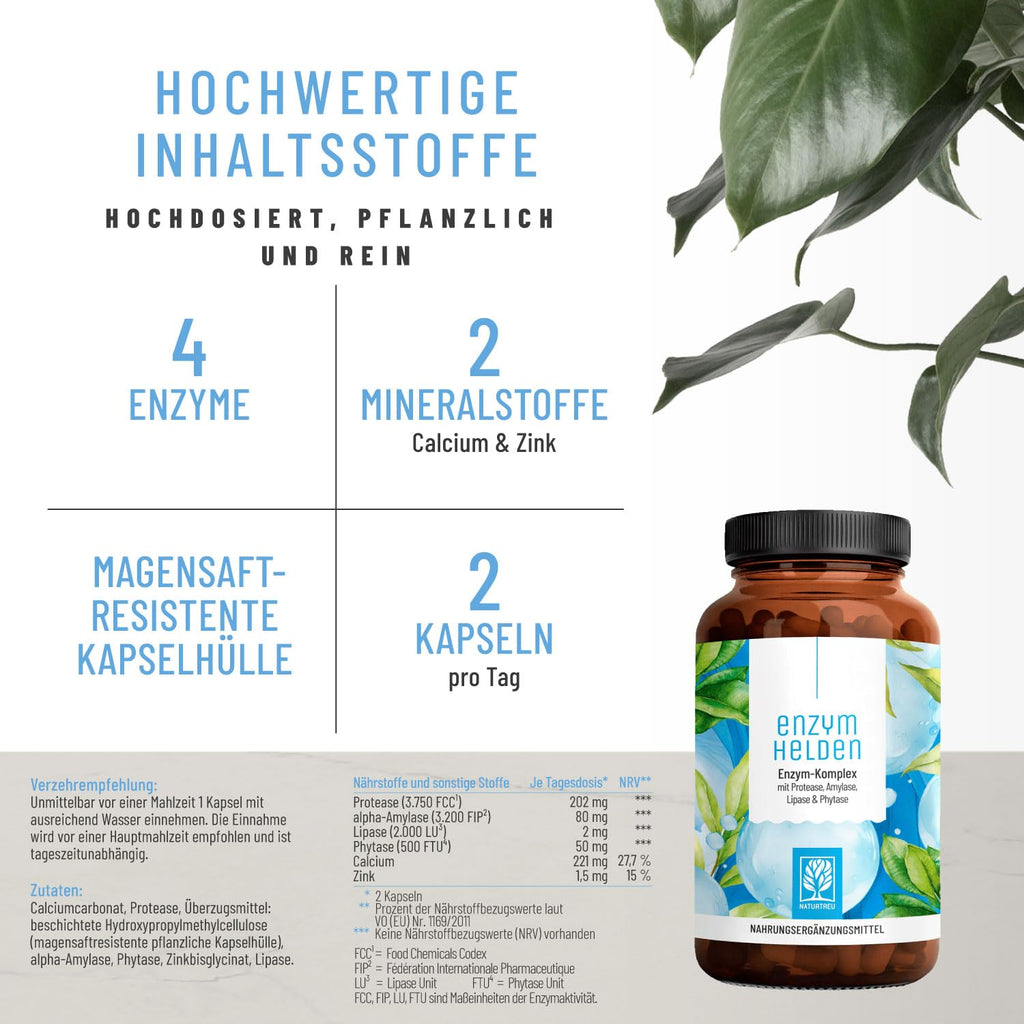 - EFFEKTIVES ENZYM-SPEKTRUM - 4 Verdauungsenzyme in einer Kapsel: Protease, α‑Amylase, Lipase & Phytase ergänzen die körpereigene Enzymvielfalt zur Aufspaltung von Eiweißen, Kohlenhydraten, Fetten und Phytinsäure. Calcium trägt zur normalen Funktion von Verdauungsenzymen bei, Zink unterstützt den normalen Stoffwechsel von Makronährstoffen.