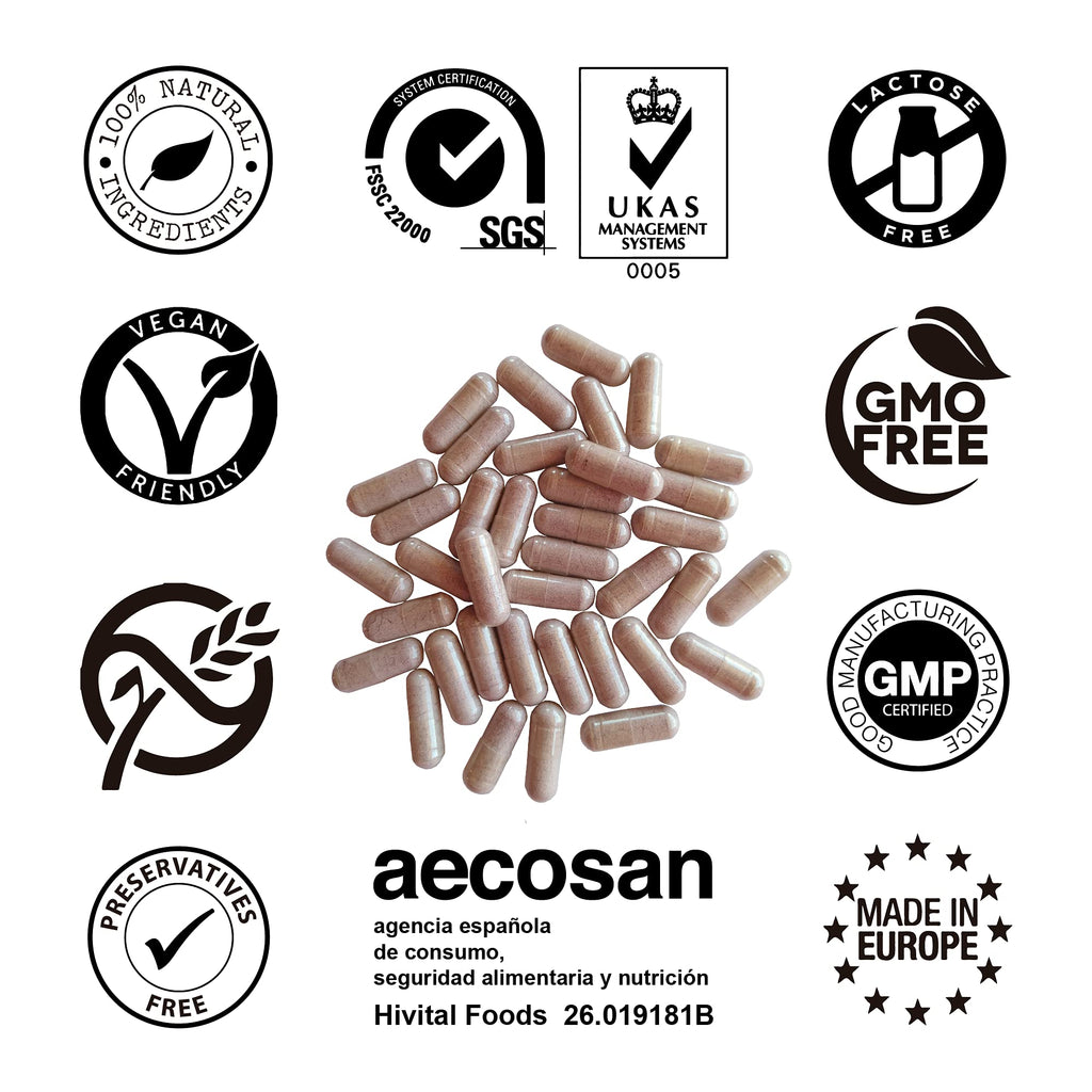 - 🌿 HÖCHSTE QUALITÄT UND 100% GARANTIE: Wir bieten 180 vegane Kapseln pro Flasche. Unser Produkt ist 100% natürlich, vegan, glutenfrei, laktosefrei, sojafrei, magnesiumstearatfrei, zuckerfrei, ohne Konservierungsstoffe oder künstliche Farbstoffe, ohne zugesetzte Aromen und GVO-frei. HERGESTELLT IN EUROPA (Barcelona) unter GMP- und ISO-Zertifikaten. Hivital Foods ist bei der AESAN unter der Nummer 26.019181B registriert.