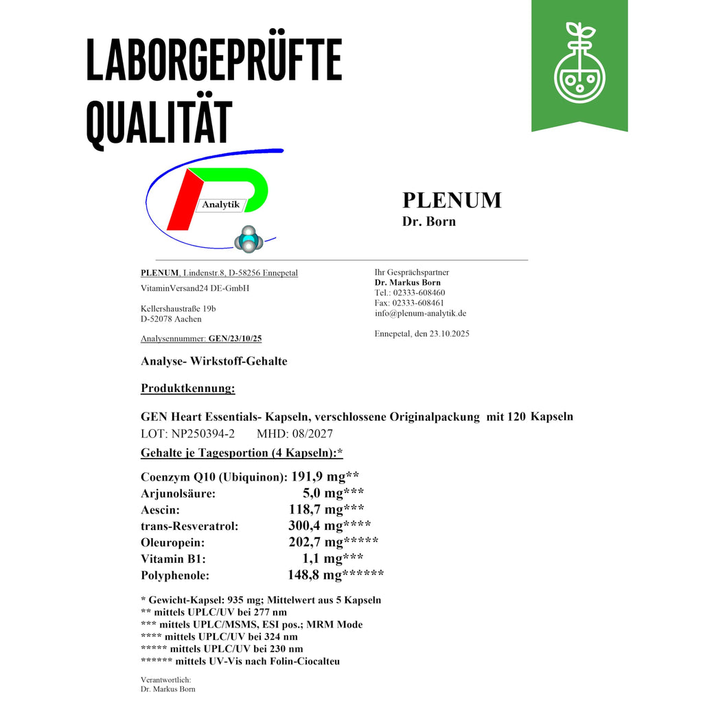 • HOCHDOSIERTER HERZ KOMPLEX¹: 120 vegane Kapseln mit wertvollen Pflanzenextrakten, Coenzym Q10 & Vitamin B1. Unser Herzkomplex kombiniert hochdosierte Extrakte aus Arjuna, Citrus Bergamot, Rosskastanie, Olivenblatt sowie Resveratrol aus japanischem Staudenknöterich mit Coenzym Q10 und Vitamin B1. Vitamin B1 trägt zur normalen Herzfunktion bei¹ und rundet die Rezeptur optimal ab, ideal für deine tägliche Routine auf natürlicher Basis.
