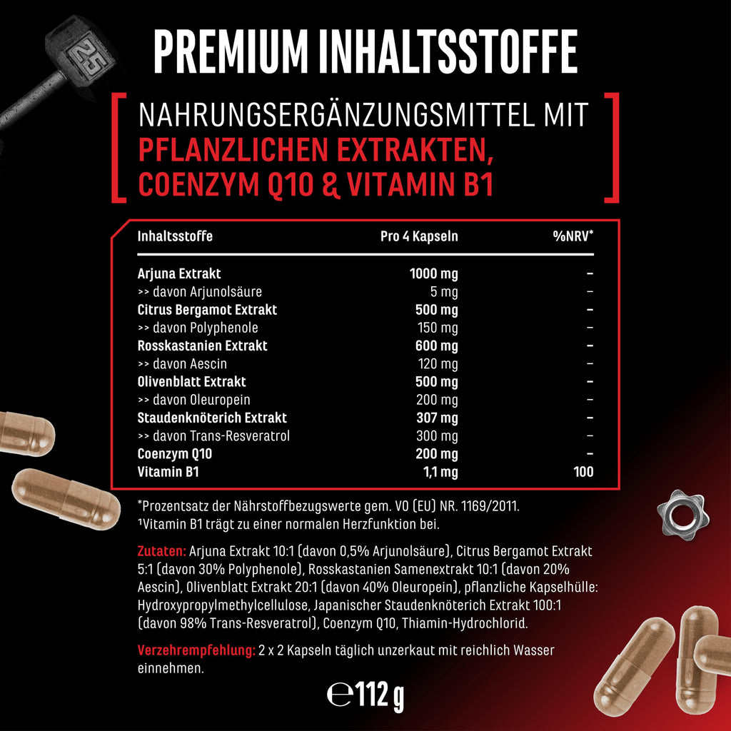 • SYNERGETISCHE WIRKSTOFF-KOMBINATION: Pro Tagesportion (4 Kapseln) liefert unser Herz-Komplex 3108 mg sorgfältig ausgewählte Pflanzenstoffe & Vitalstoffe. Darunter 1000 mg Arjuna-Extrakt (10:1) mit 5 mg Arjunolsäure, 500 mg Citrus-Bergamot-Extrakt (5:1) mit 150 mg Polyphenolen, 600 mg Rosskastanien-Extrakt (10:1) mit 120 mg Aescin, 200 mg Olivenblatt-Extrakt (20:1) mit 80 mg Oleuropein sowie 307 mg Staudenknöterich-Extrakt (100:1) mit 300 mg Trans-Resveratrol. Ergänzt wird die Rezeptur durch 200 mg Coenzym Q10 und 1,1 mg Vitamin B1.