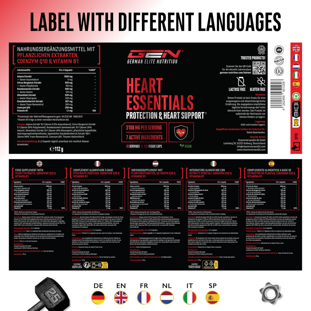 Heart Essentials - 120 Kapseln - Herz Komplex* mit hochdosierten 200mg Q10, 1000mg Arjuna Extrakt, 750mg Citrus Bergamot, Rosskastanien, Resveratrol, Olivenblatt, Vitamin B1 - Vegan