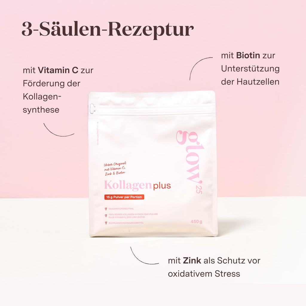 Glow25® Collagen Plus Pulver [450g] - Kollagen Hydrolysat mit Vitamin C, Zink und Biotin - Peptide Typ 1 und 3 - Gute Löslichkeit - Neutral