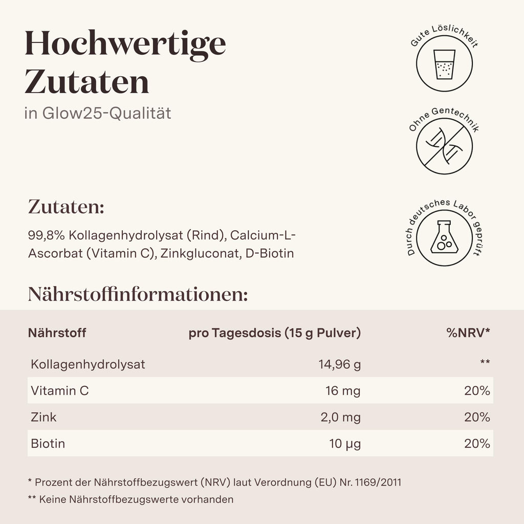 • DAS GLOW25 VERSPRECHEN – Deine Zufriedenheit ist unser Anspruch! Falls Du mit unserem Kollagen nicht zufrieden sein solltest, erhältst Du innerhalb der 60 Tage ab Kauf sofort dein Geld zurück. (Dein Widerrufsrecht bleibt davon unberührt.)