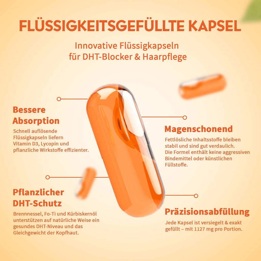 - Flüssigkapseln mit moderner Technologie: Im Gegensatz zu herkömmlichen Tabletten oder Pulver setzen die innovativen Flüssigkapseln auf eine flüssige Basis. Fettlösliche Stoffe wie Vitamin D3 und Lycopin sind darin gleichmäßig verteilt. Diese Kapseln lösen sich leicht auf und sind schonend.
