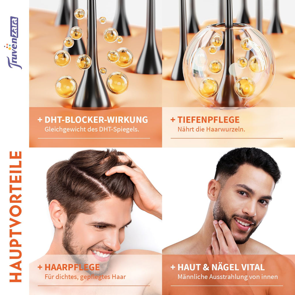 - Mit Vitamin D, Zink & Biotin: Truvenzara's DHT-Blocker enthält eine Auswahl an Vitaminen und Mineralstoffen, darunter Biotin, Vitamin D3 und Zink. ideal abgestimmt auf die Rezeptur.