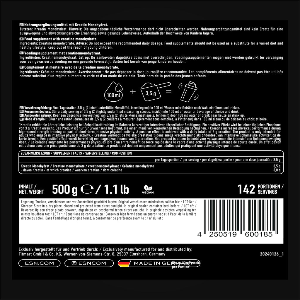 - DEUTSCHES QUALITÄTSPRODUKT: ESN Ultrapure Creatine wird in modernsten Anlagen nach höchsten Qualitätsstandards hergestellt