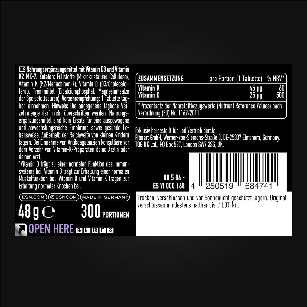 - MADE IN GERMANY: Unsere ESN Vitamin D3 K2 Kapseln werden in unserer hauseigenen deutschen Produktion nach höchsten Qualitätsstandards hergestellt