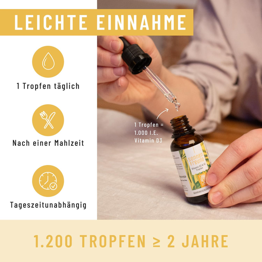 - SORGFÄLTIG & OHNE ZUSÄTZE: Die Sonnenfreund Vitamin D3 K2 Tropfen hochdosiert sind vegan, ohne Gentechnik & Tierversuche und ohne Zusatz-, Füll- oder Farbstoffe