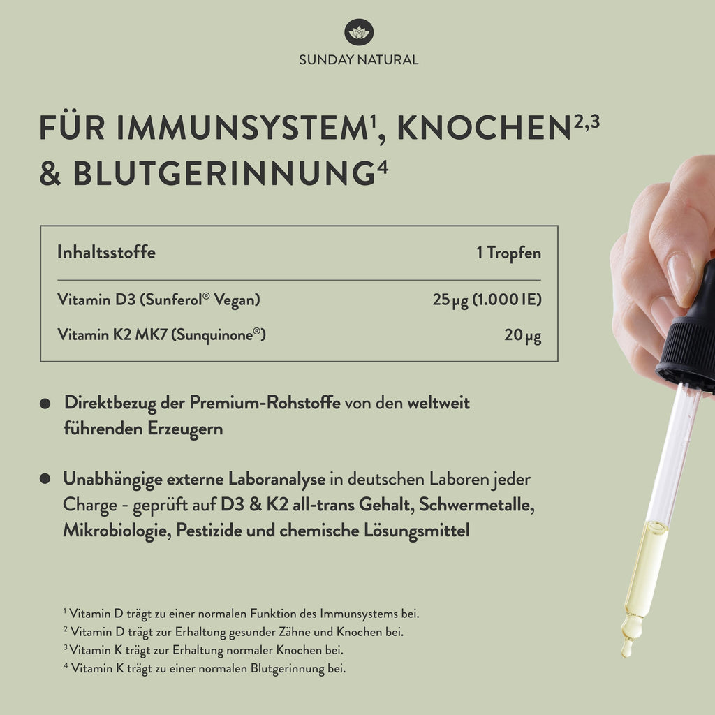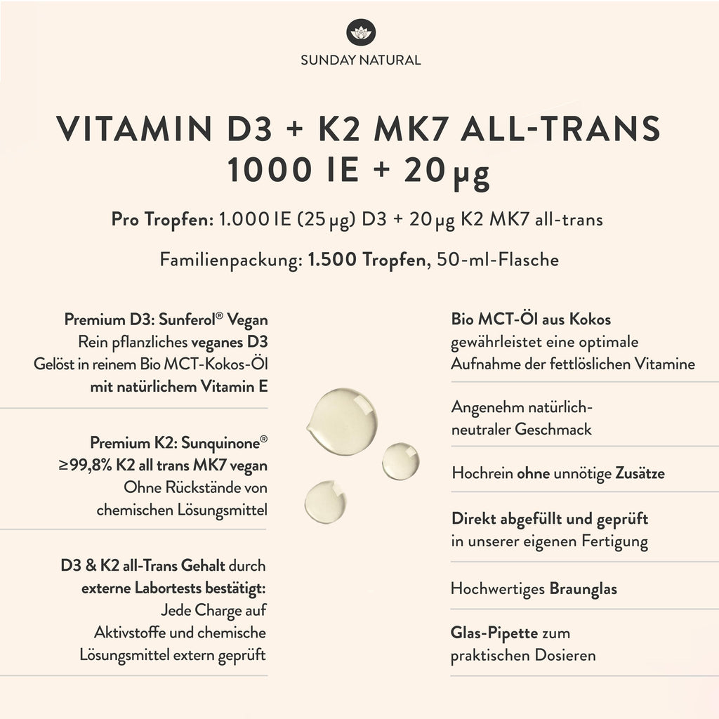 - SUNDAY NATURAL D3 K2: Sunferol D3 Vegan und Sunquinone K2-MK7 sind speziell für Sunday Natural entwickelte Premium-Wirkstoffe. Vitamin D3 K2 wird nur mit Fett optimal aufgenommen - deshalb verwenden wir für unsere hochdosierten D3 K2 Tropfen feinstes Bio MCT-Öl aus pestizidfreiem Kokosanbau - Optimal für Stabilität und Schutz der Inhaltsstoffe.